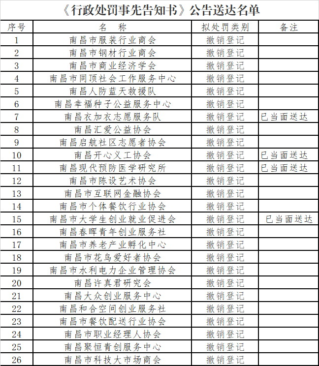 经调查, 南昌市服装行业商会等26家社会组织(名单附后) 在2019年度至2021年度连续两年以上(含两年)未按规定接受年度检查,违反了《社会团体登记管理条例》第二十八条、《民办非企业单位登记管理暂行条例》第二十三条的规定。依据《社会团体登记管理条例》第三十条第一款第(三)项、《民办非企业单位登记管理暂行条例》第二十五条第一款第(三)项的规定,本机关拟对你们作出撤销登记的行政处罚。